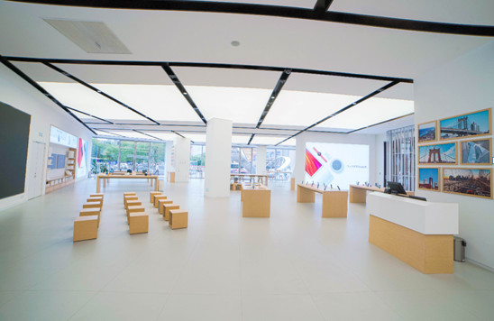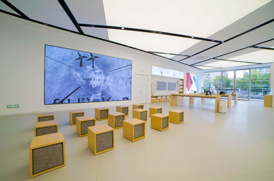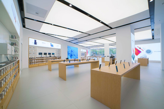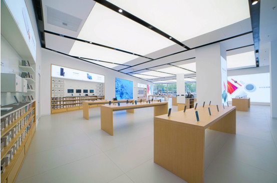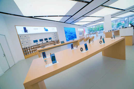 体验店内空间的线条设计非常考究,天花灯槽、地面、柱面、柜体及玻璃幕墙拼缝都实现对齐。这种设计在第一眼并无惊艳之感,但当顾客进入店内,高度对称工整的美学感官还是让人惊叹的。正是这种“润物无声”的设计,给消费者提供了更宽阔舒适的购物空间,保证了体验的品质与细节,让消费者轻松享受华为全场景全品类的体验。